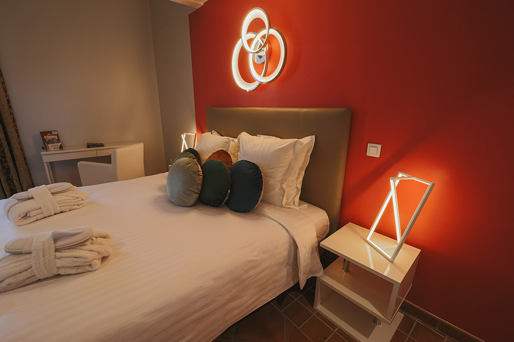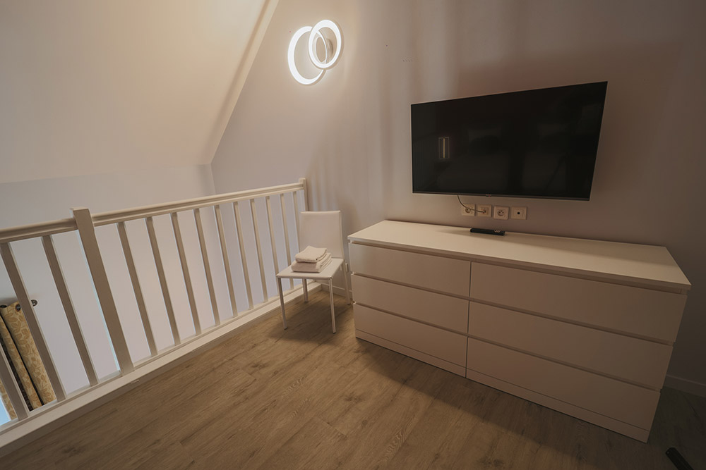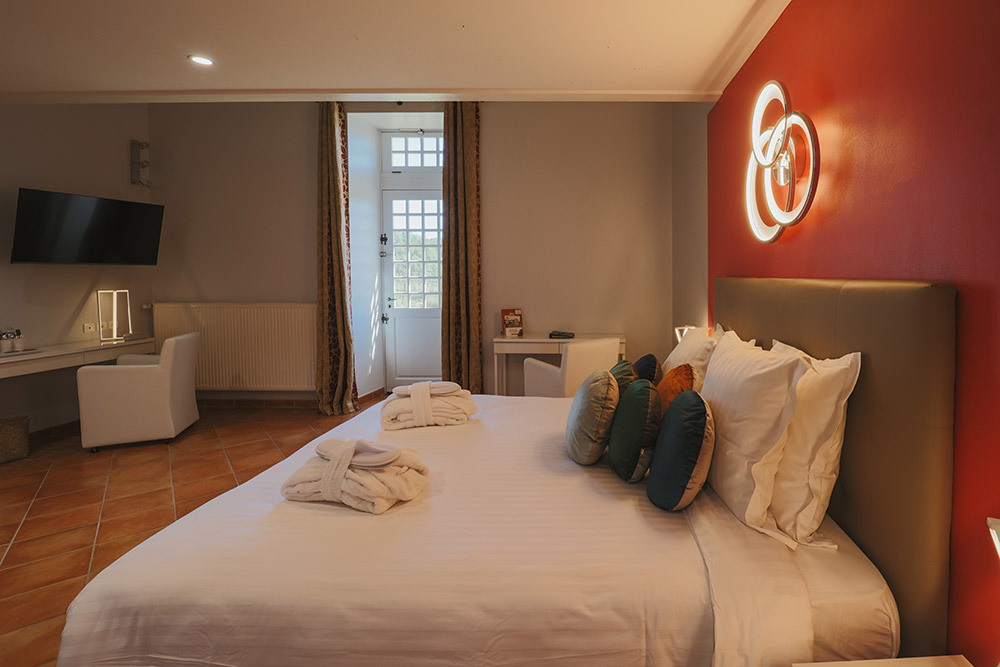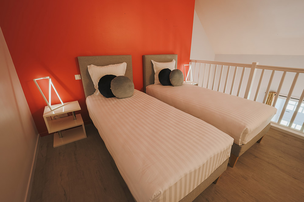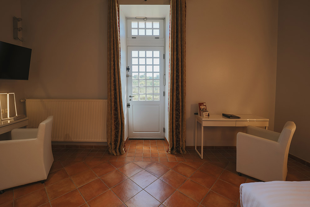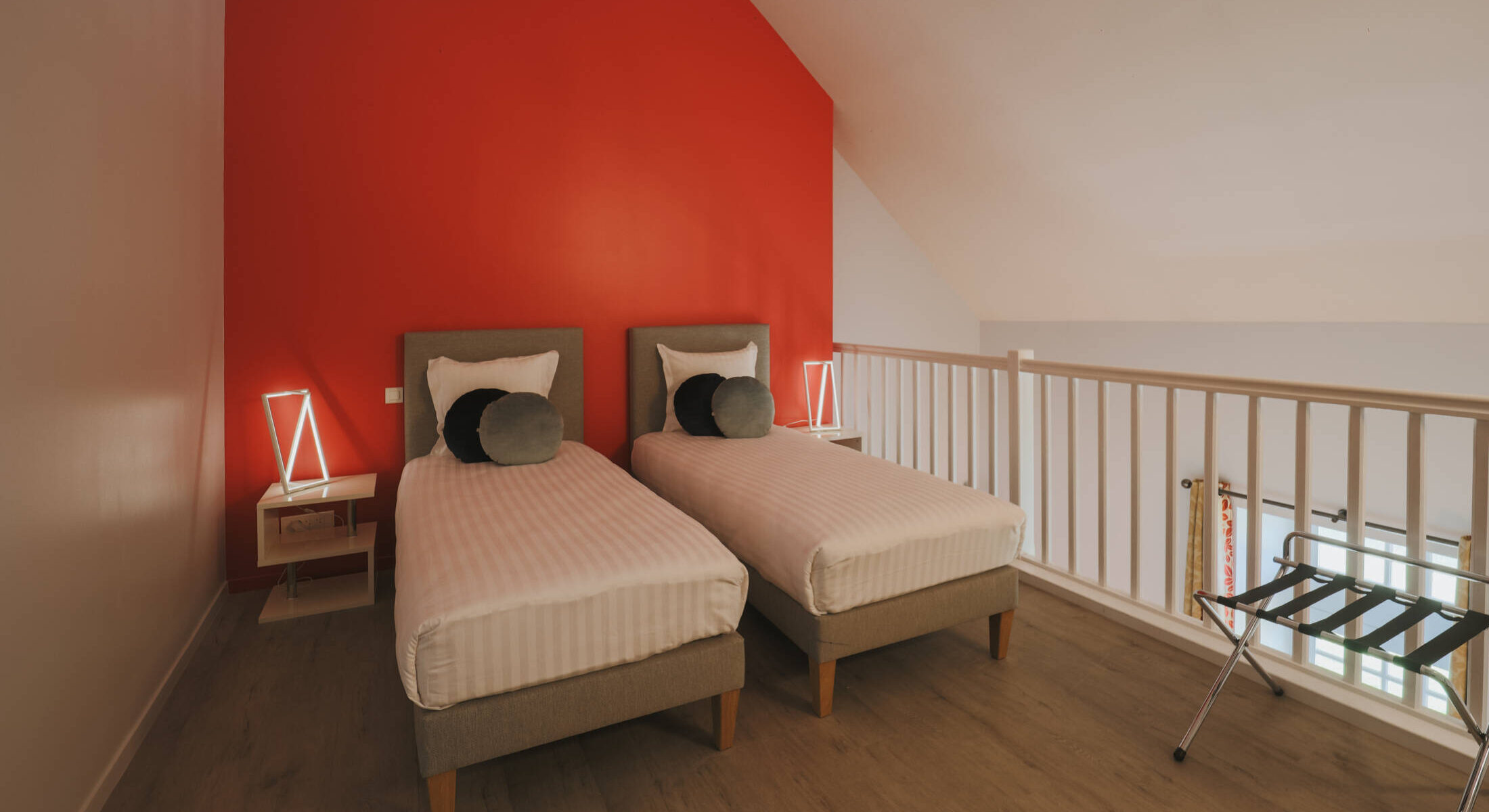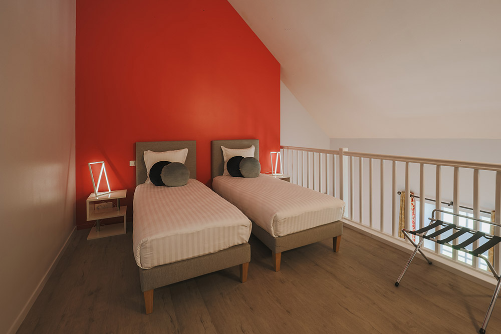 Nestled in the heart of the Casernement Nord (North Barracks), it used to be the officers’ residence, this duplex is designed to accommodate up to 4 guests. Accessible by an independent entrance outside, this spacious Suite offers a clever layout with a cozy bedroom on the ground floor. On the mezzanine level, another cozy bedroom space ensures peaceful sleep. The adjoining bathroom is equipped with a bathtub. The Quadruple Suite, designed for your comfort, includes a double bed and 2 single beds. All the essential amenities are at your disposal, including a telephone, a TV, and a desk.