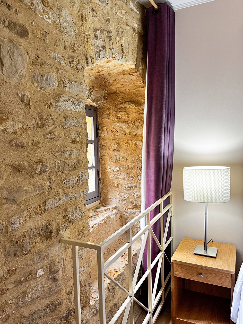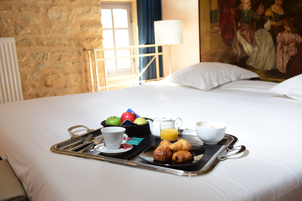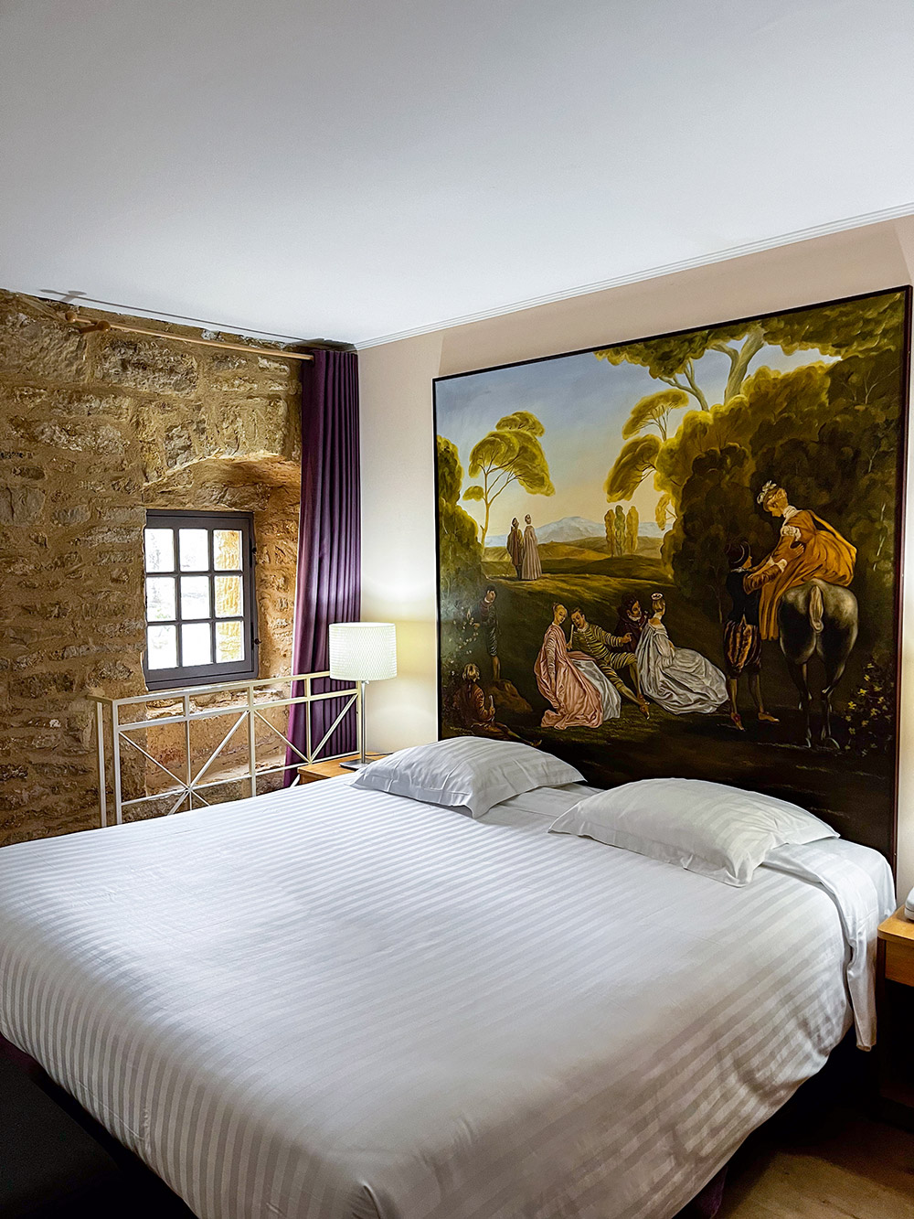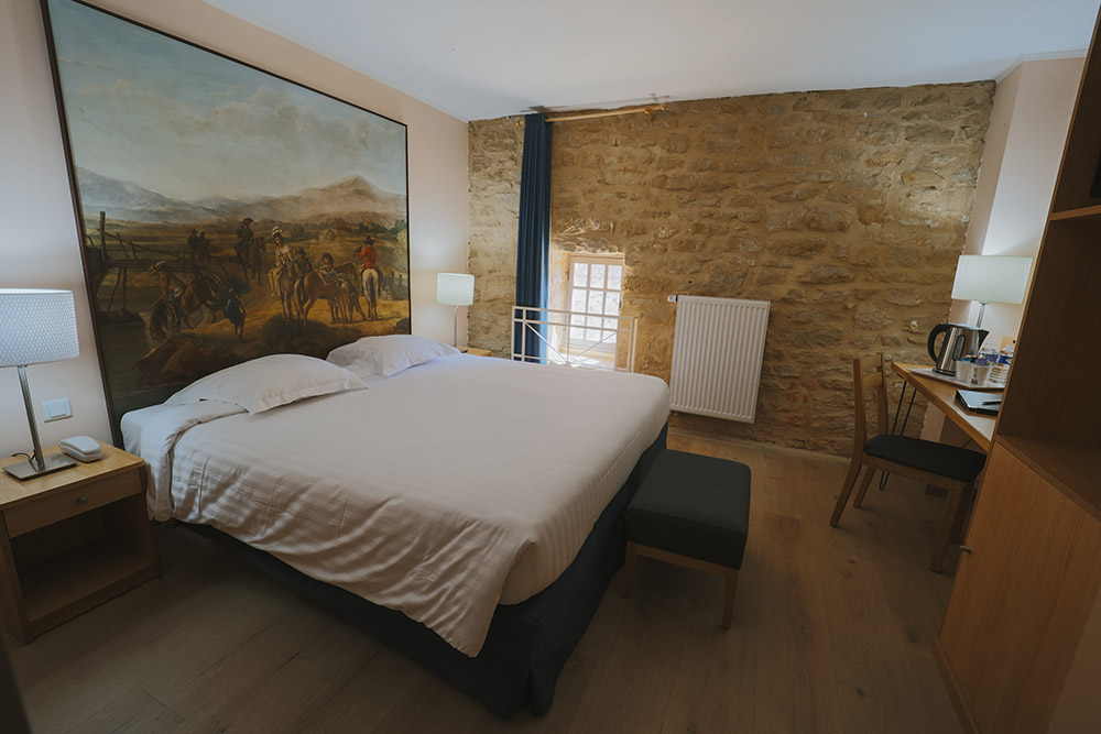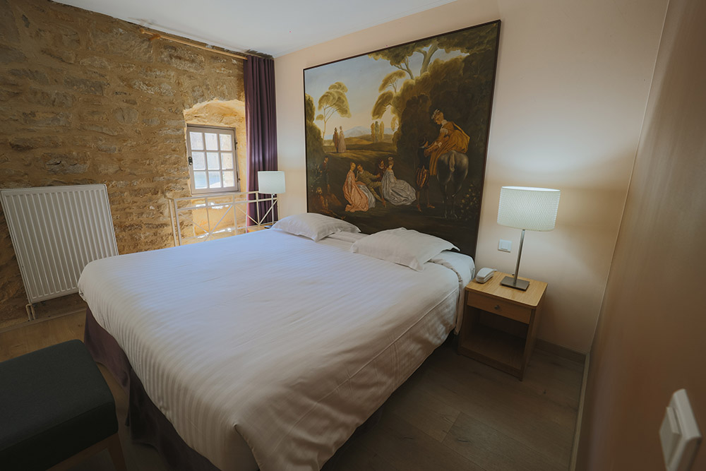 Découvrez notre chambre offrant une vue imprenable sur la cour majestueuse du château. Imprégnez-vous de l’histoire avec une peinture en tête de lit et un mur en pierre jaune de Dom, témoins authentiques de notre patrimoine.